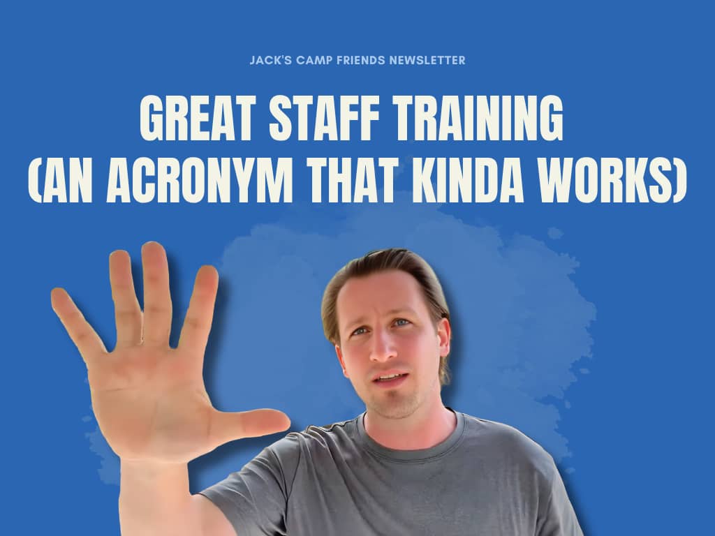 about 2 months ago • 4 min readJack's Camp Friends Newsletter Subscribe Here Two Quick and VERY IMPORTANT Things 1 → Check out the PS for the Tri-State Parties we are throwing. Thank you IENA and CampMinder for helping make those happen 2 →We are running the Staff Training Sprint Cohort this spring, 4 days over 2 weeks, building out a great camp staff training. Put your name on the waitlist and be the first to get the details, or just vote in the poll below Staff Training Sprint Cohort - Interested in more details? Yes! I...