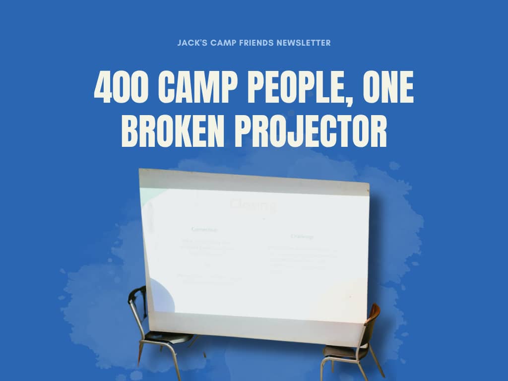 23 days ago • 1 min readJack's Camp Friends Newsletter Subscribe Here Had an awesome time at Tri-State. Saw so many of you in the halls, the sessions, at Camp Idol, at Campchella. These conferences are the best. And also got to run a staff training session for about 400 camp pros. Everything was going great. Getting into different groups based on songs of the summer and a bunch of other shenanigans. But then the projector broke. Whoops. It happens. So what did we do? What camp staff always does: we pivoted into...